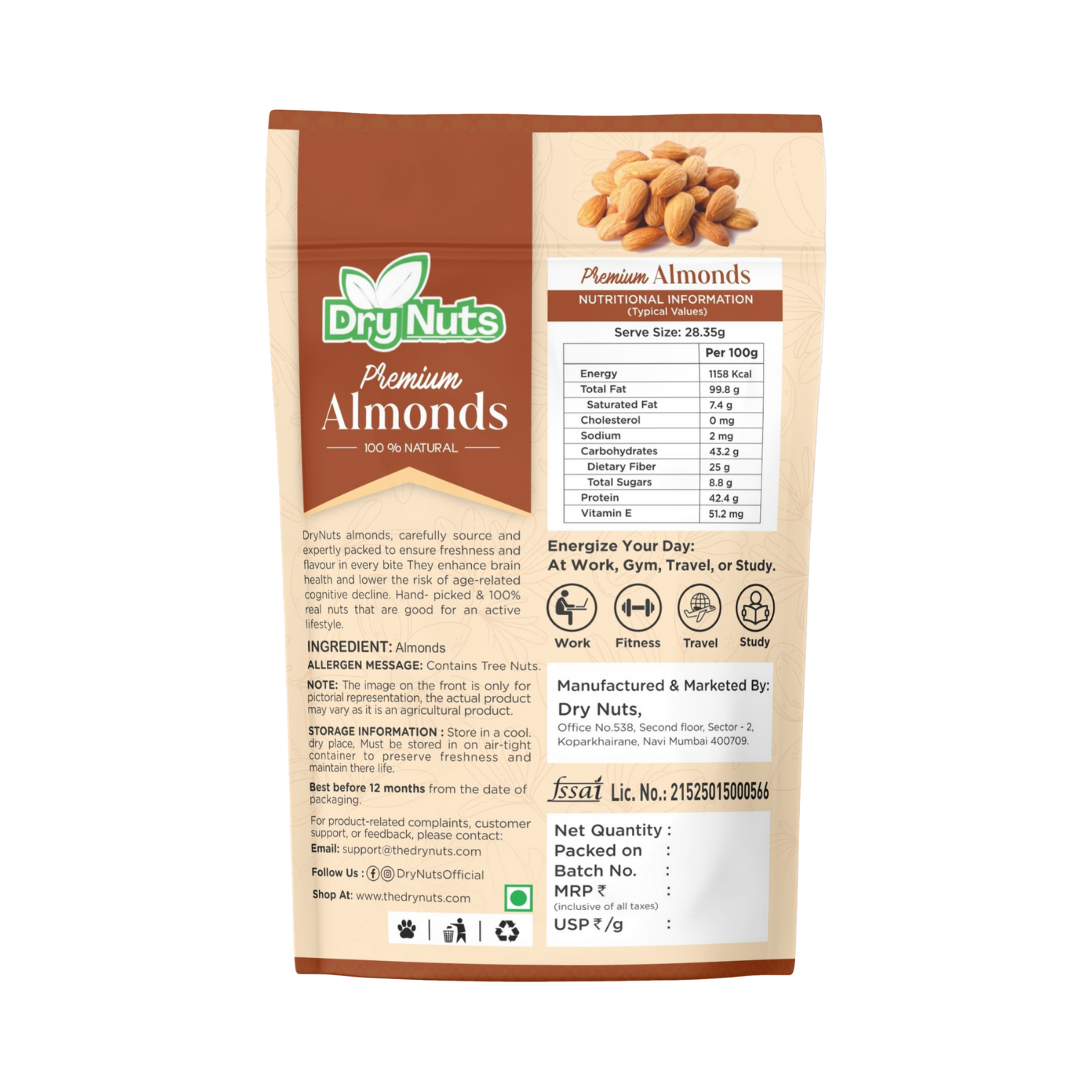 Enjoy the natural taste of best quality almonds from Dry Nuts. Fresh, crunchy, and rich in almond protein, these healthy dry fruits are available in 250gm, 500gm & 1kg packs at the best almond price online.